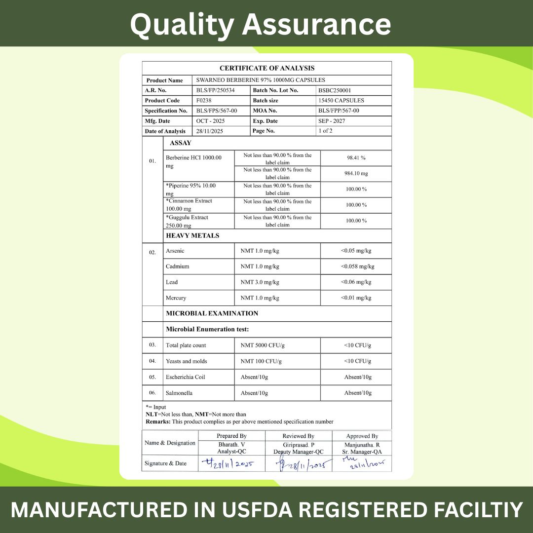 Swarneo Berberine Capsules are made with high-quality ingredients, free from harmful additives. Non-GMO, Gluten-Free, Vegetarian, and manufactured under strict quality standards.