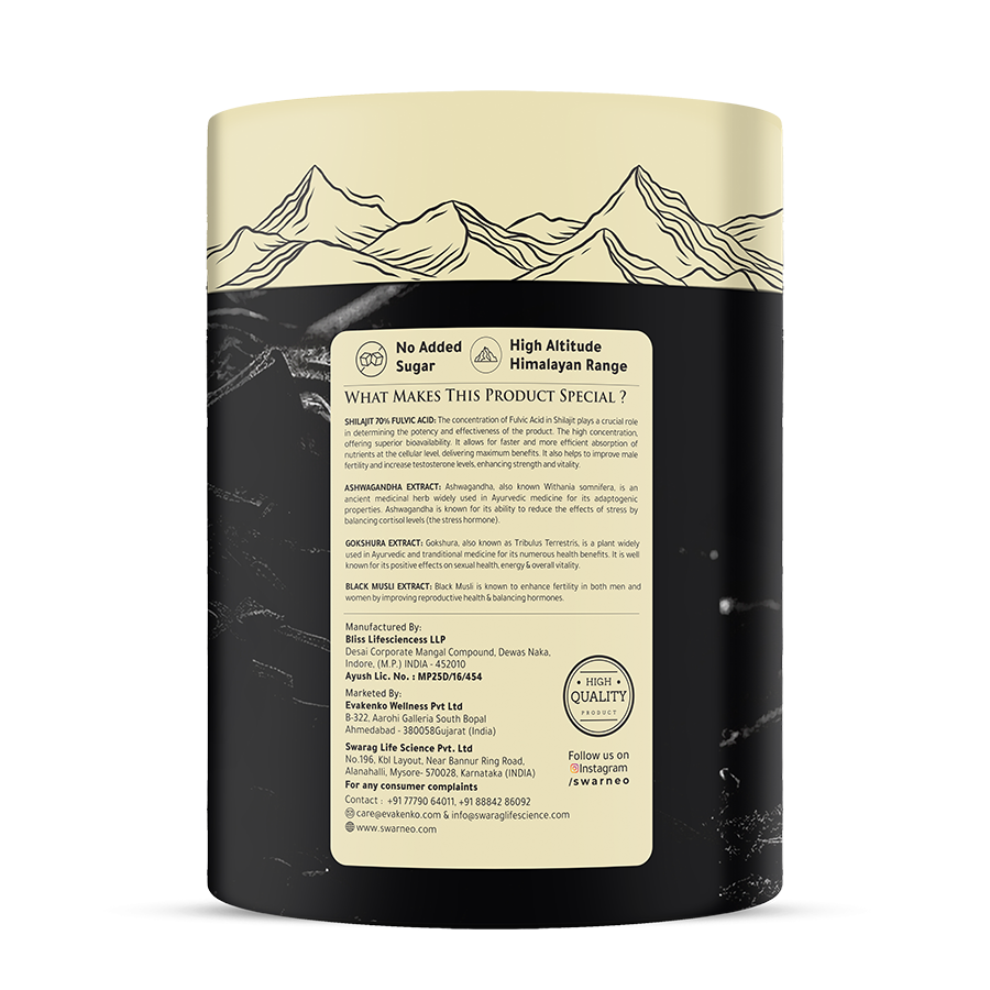 The concentration of Fulvic Acid in Shilajit is a key factor in its potency and effectiveness. With 70% Fulvic Acid, this product offers the high concentration, ensuring superior bioavailability. This allows for faster and more efficient absorption of nutrients at the cellular level, maximizing health benefits. It also helps to improve male fertility and increase testosterone levels.