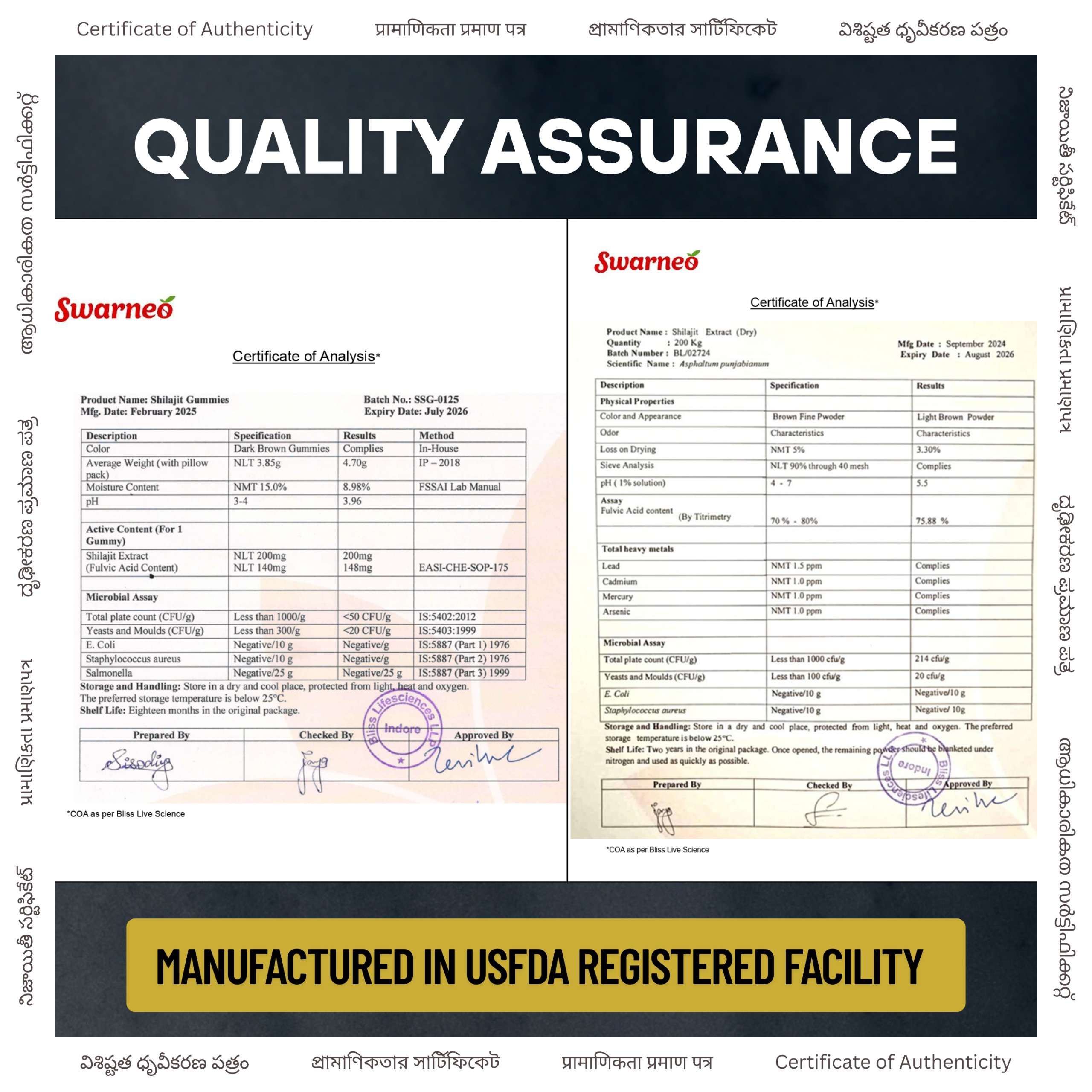 Swarneo Himalayan Shilajit/Shilajeet Gummies are made of pure Himalayan shilajit with more than 70% Fulvic Acid extracted from high altitude of Himalayan range. They are scientifically crafted to boost stamina, enhance power & strength, support immune system and increase energy level.